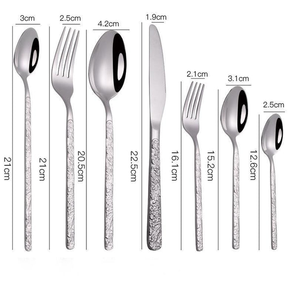 Crafted from premium stainless steel, this cutlery set features elegantly embossed textured handles that enhance grip and style. The refined design adds a touch of sophistication to any table setting, making it perfect for both everyday dining and special occasions. Durable and resistant to tarnish, this cutlery promises lasting beauty and effortless elegance with every use.